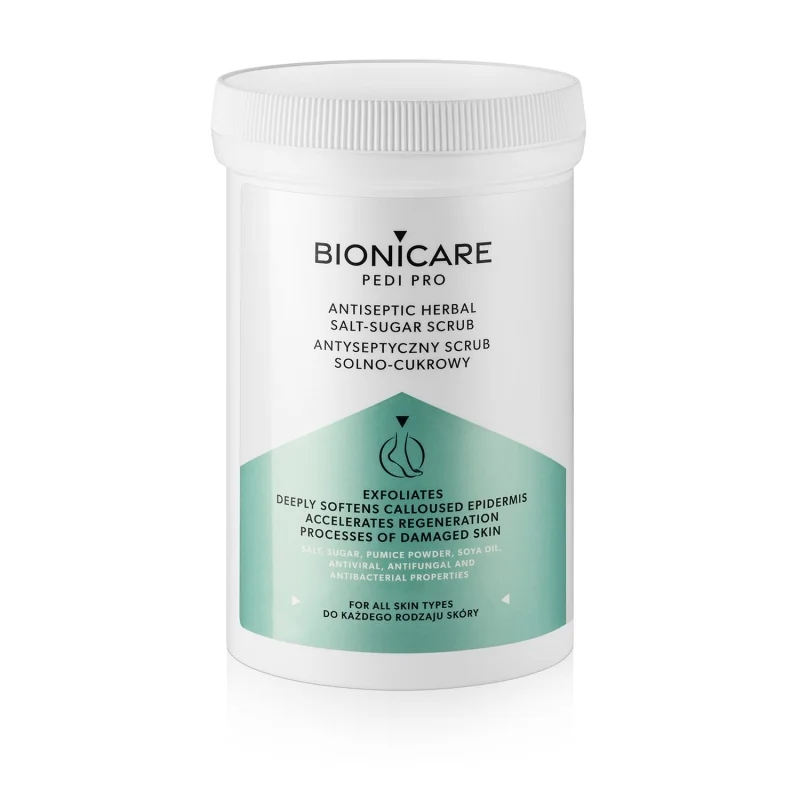 Bionicare Antiseptisches Salz- und Zuckerpeeling. Das Salz-Zucker-Fußpeeling trägt Hornhaut effektiv ab und macht sie intensiv weich. Dank des Gehalts an wertvollen Ölbestandteilen beschleunigt es die Regenerationsprozesse der geschädigten Haut und hilft, ihre Elastität zu verbessern. Die in dem Peeling enthaltenen Inhaltstoffe haben antivirale, antimykotische und antibakterielle Eigenschaften. Die hohe Wirksamkeit des Produkts wurde von Podologen bestätigt.